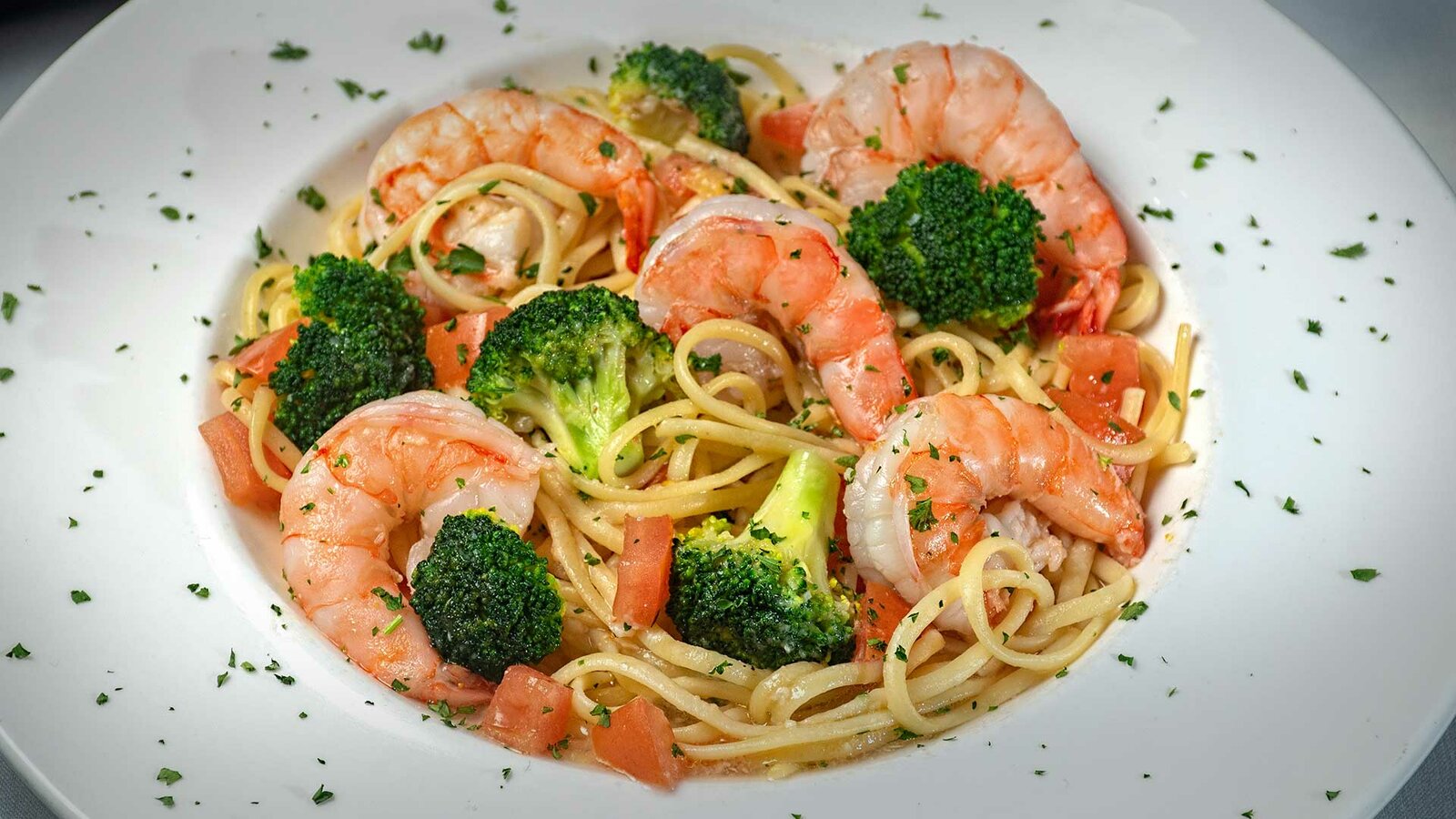 Sauteed shrimp with broccoli and diced tomatoes in a garlic lemon white wine sauce served over linguini.